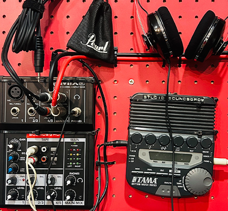 コンパクトミキサー、クリック、ヘッドフォン、スマホ接続用ケーブルを常設しております。メインミキサーへの出力も可能です。
